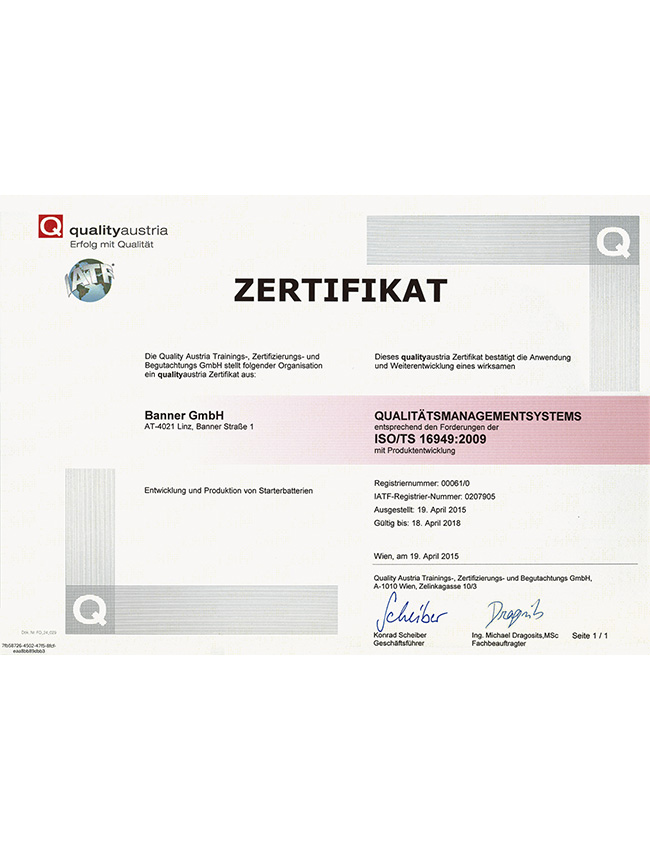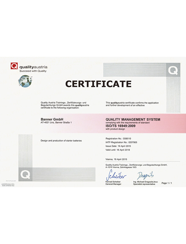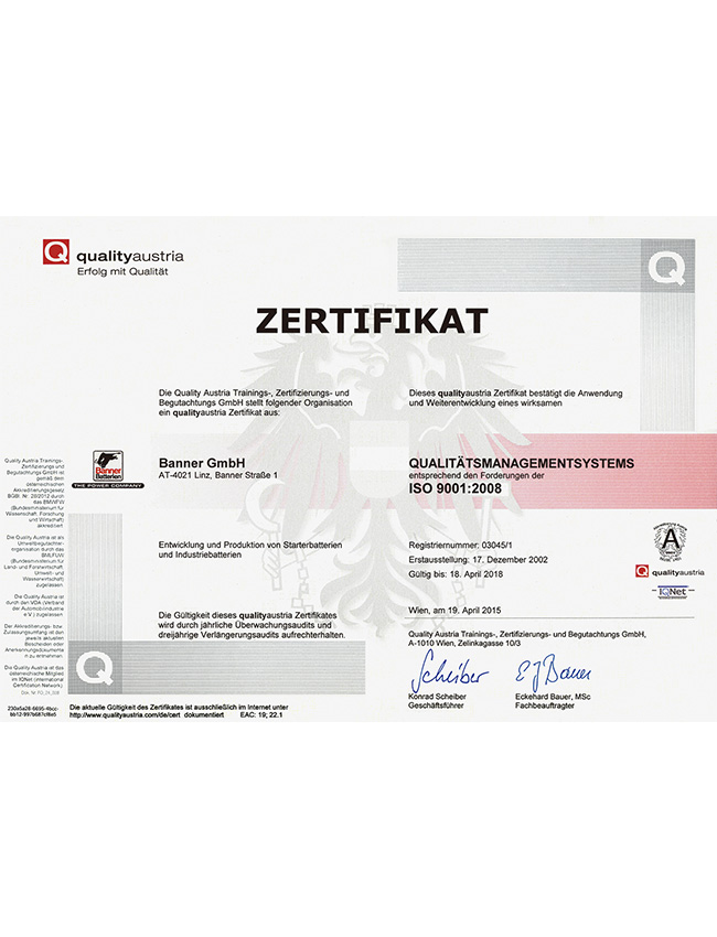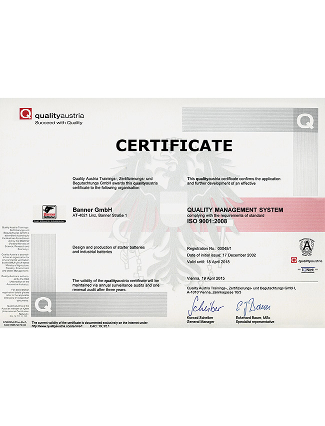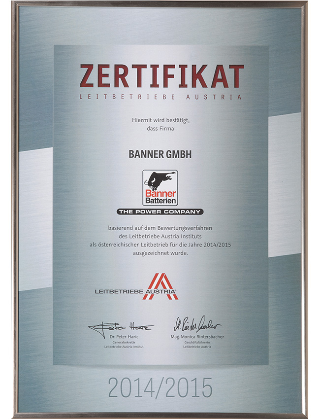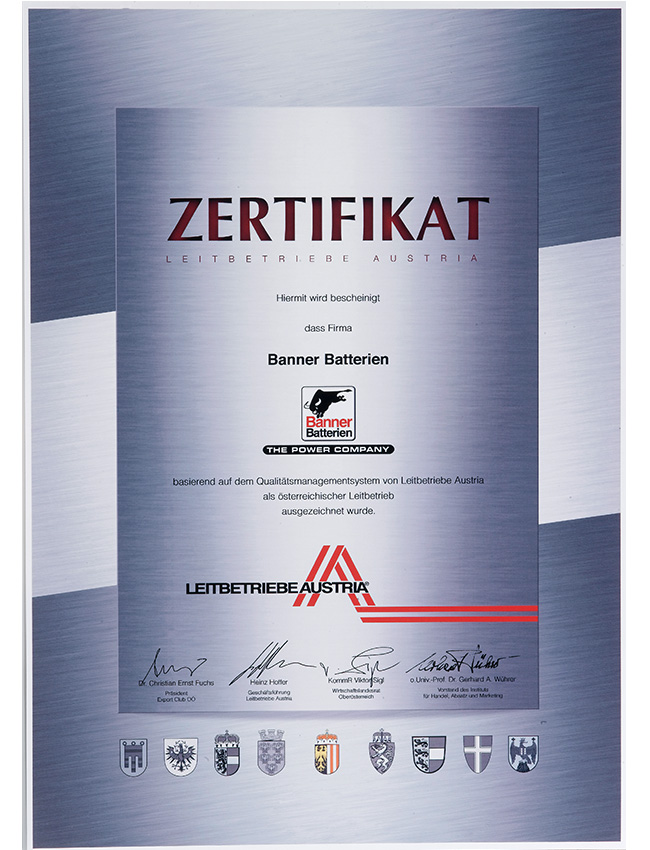 作为欧洲龙头的电池品牌,Banner制造和销售具备优秀品质的,适用于驱动系统和电力供应的启动电池和工业电池。在林茨-莱昂丁的生产工厂中,Banner拥有欧洲最现代化、最环保的电池工厂之一。Banner为宝马、劳斯莱斯、阿斯顿马丁、保时捷、奔驰、奥迪、大众、铃木、沃尔沃、西雅特、凯斯鲍尔、利勃海尔等汽车制造商提供配套。在过去的80年里,著名的大红牛标志代表了满足最严格的质量标准的电池生产,800名员工共同确保了品牌持久的成功。